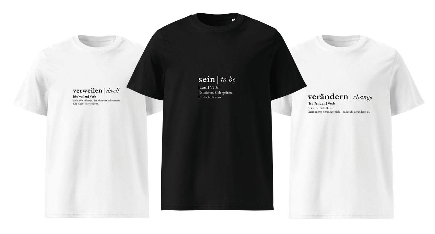 Jedes Shirt ist mehr als nur ein Kleidungsstück, es ist ein Statement. Von Worten, die bewegen, motivieren und zum Nachdenken anregen, inspiriert, kombinieren unsere Designs minimalistischen Stil mit einer starken Botschaft. Ob „Veränderung“, „Sein“ oder „Verweilen“ – jede Definition erzählt eine Geschichte und erinnert dich daran, was im Leben wirklich zählt. Dank weichem Stoff, zeitlosem Design und klarer Typografie werden diese Shirts zu deinen täglichen Begleitern – im Alltag, auf Reisen oder bei besonderen Momenten. Trage nicht nur Mode, sondern deine Haltung.